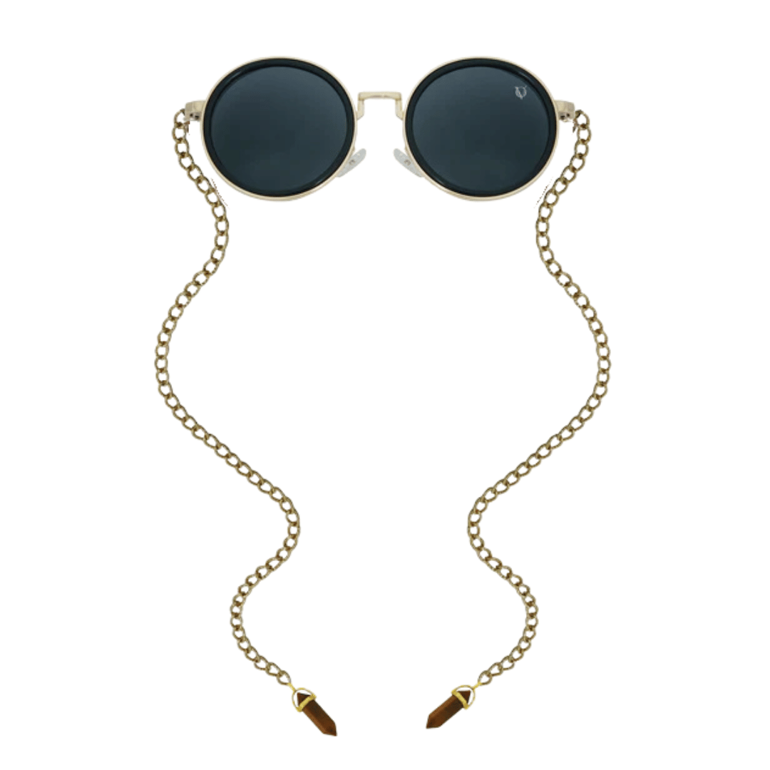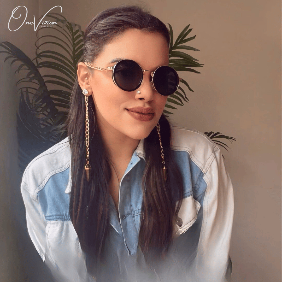 Add a touch of modern elegance and protection, Noir Oval sunglasses by OneVizion paired with multi colored GOLDEN chain with gold detailing and TIGER EYE stones. These are round dark vizion sunglasses, best for day-to-night looks. Lenses have gold finishing on its borders, which gives it a most luxurious look for statement style.